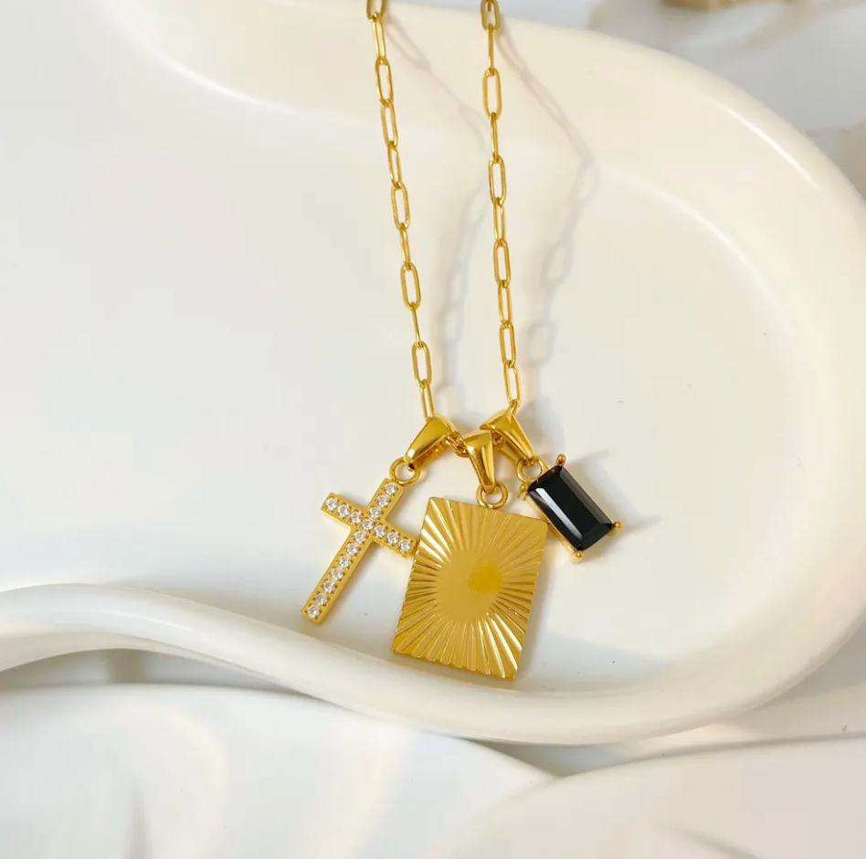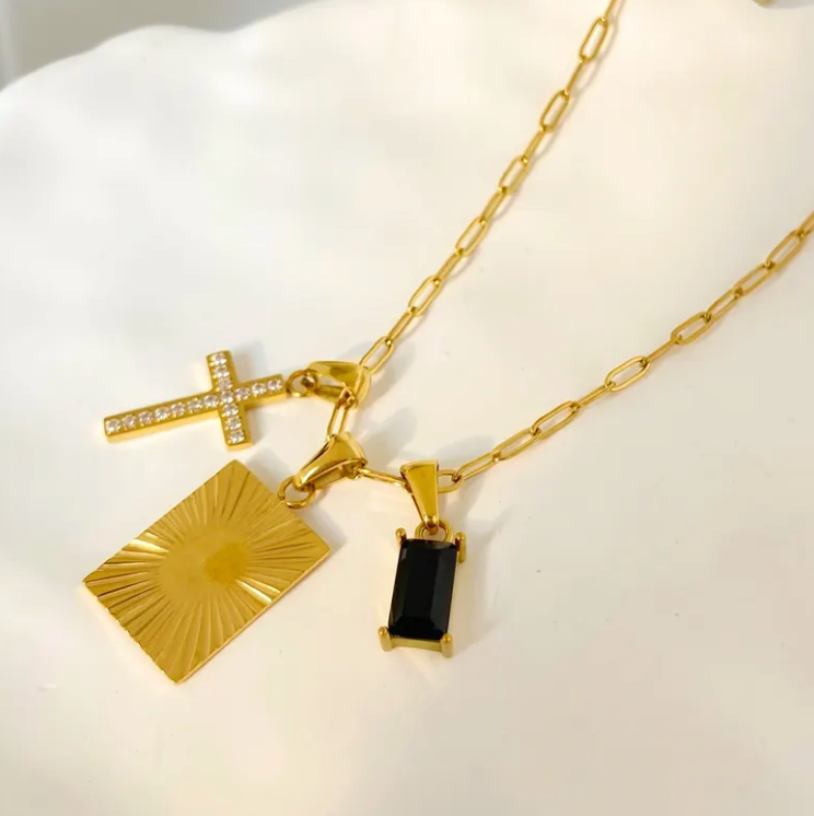 Our Alys Charm Necklace is absolutely gorgeous! Adorned with a cross, sunburst tag, and a black onyx; this necklace is an absolute show stopper.