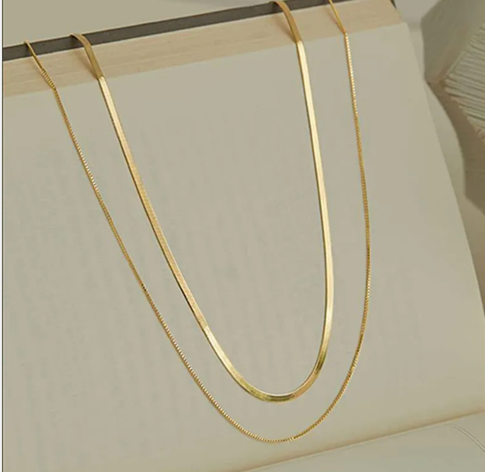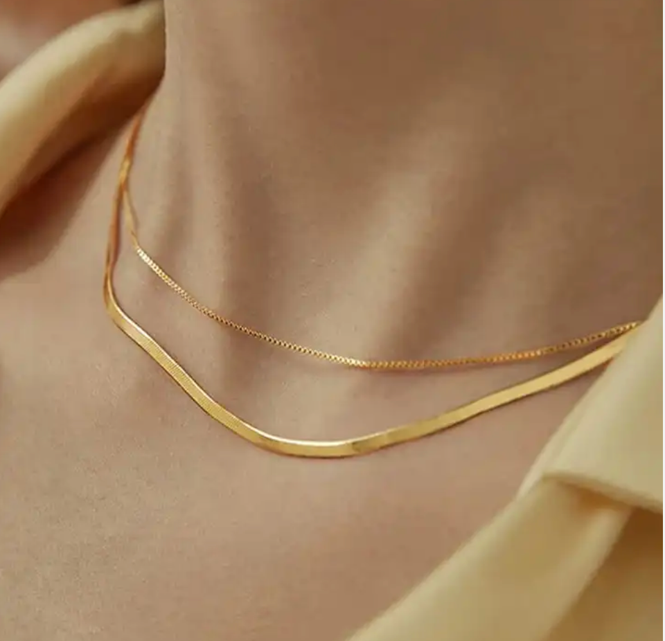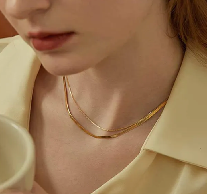 Our Isabella layered necklace set is a truly timeless stunner that can easily be worn every day. This snake chain and herringbone set is simple and sophisticated. Isabella is dainty, feminine and classy.