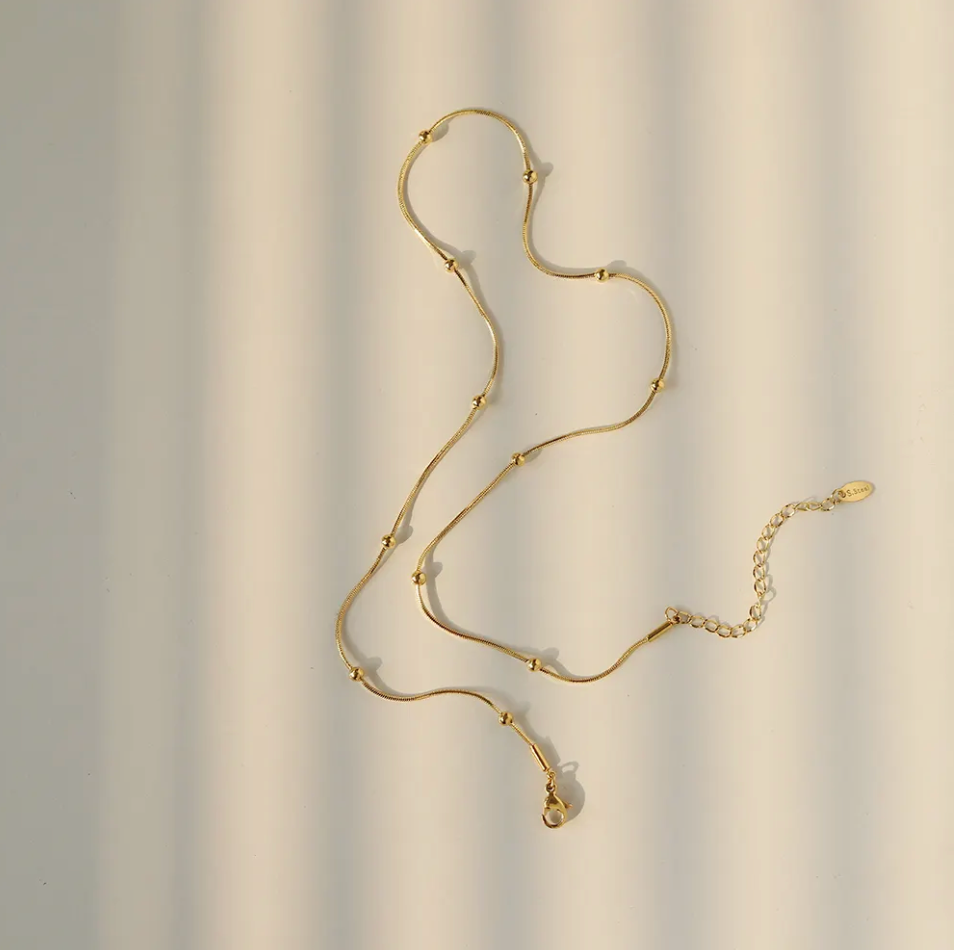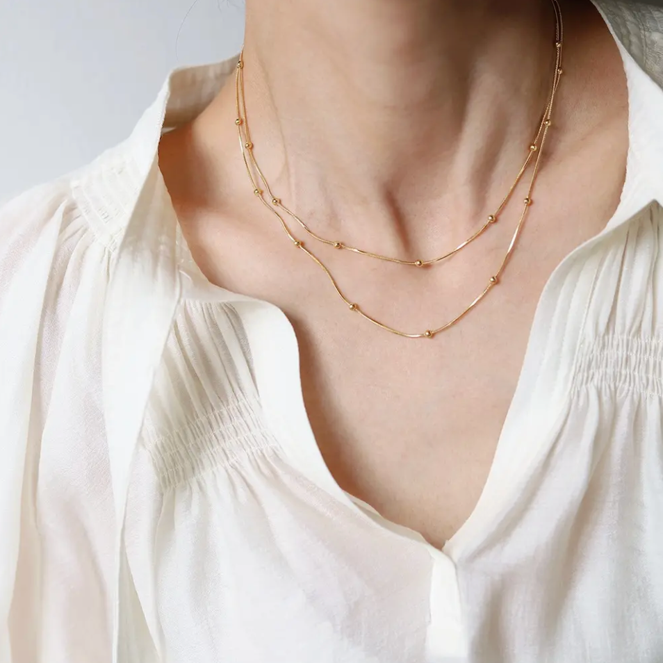 Our Ivy Necklace is an elegant snake chain and bead necklace that's both sophisticated and stylish. Wear alone or layer with other Bella Nicole Jewelry favorites. Image is shown with two necklaces layered.